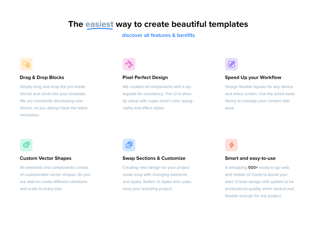 Do not waste you time anymore to build up projects totally from scratch. Pre-made assets and elements will guide you to create a powerful design project in less time. We’ve built a whopping 500+ ready-to-use UI cards for web and mobile applications. Mix-and-match sections and variants to design websites and dashboards in minutes. Work efficient with a simple, intuitive and scalable file structure organization. Set for Adobe Photoshop, Adobe XD, Sketch and Figma.